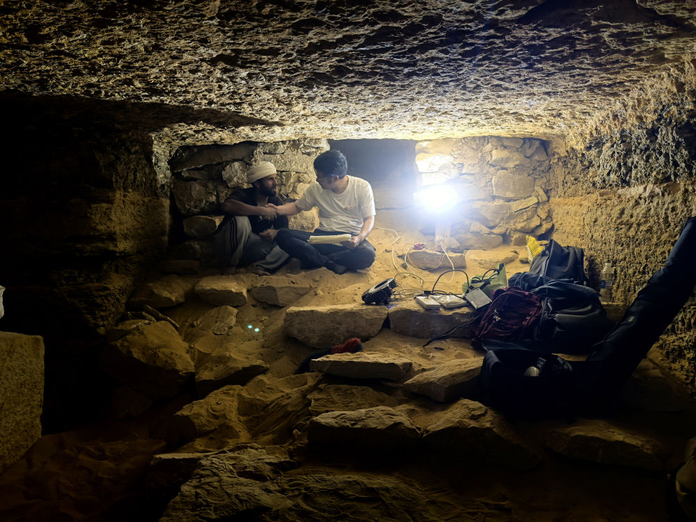 9月16日,在埃及開羅以南的薩卡拉考古遺址區(qū),中埃薩卡拉聯(lián)合考古項目中方領隊薛江(右)和埃方同行在一座貴族墓內(nèi)工作。(受訪者供圖)