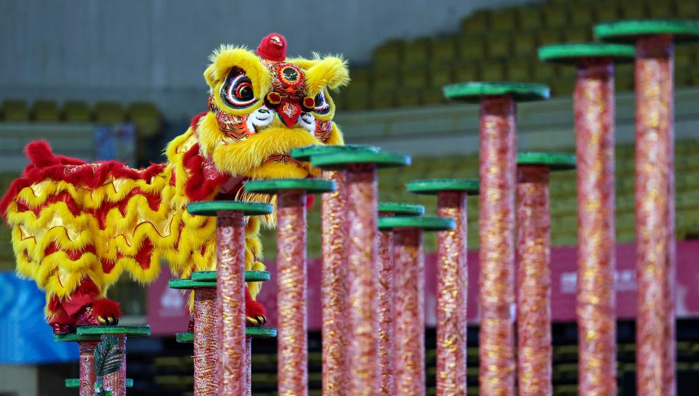 11月11日,粵港澳聯(lián)隊(duì)在第十五屆全國(guó)運(yùn)動(dòng)會(huì)群眾展演舞龍舞獅南獅自選項(xiàng)目決賽比賽中。新華社記者 王鵬 攝