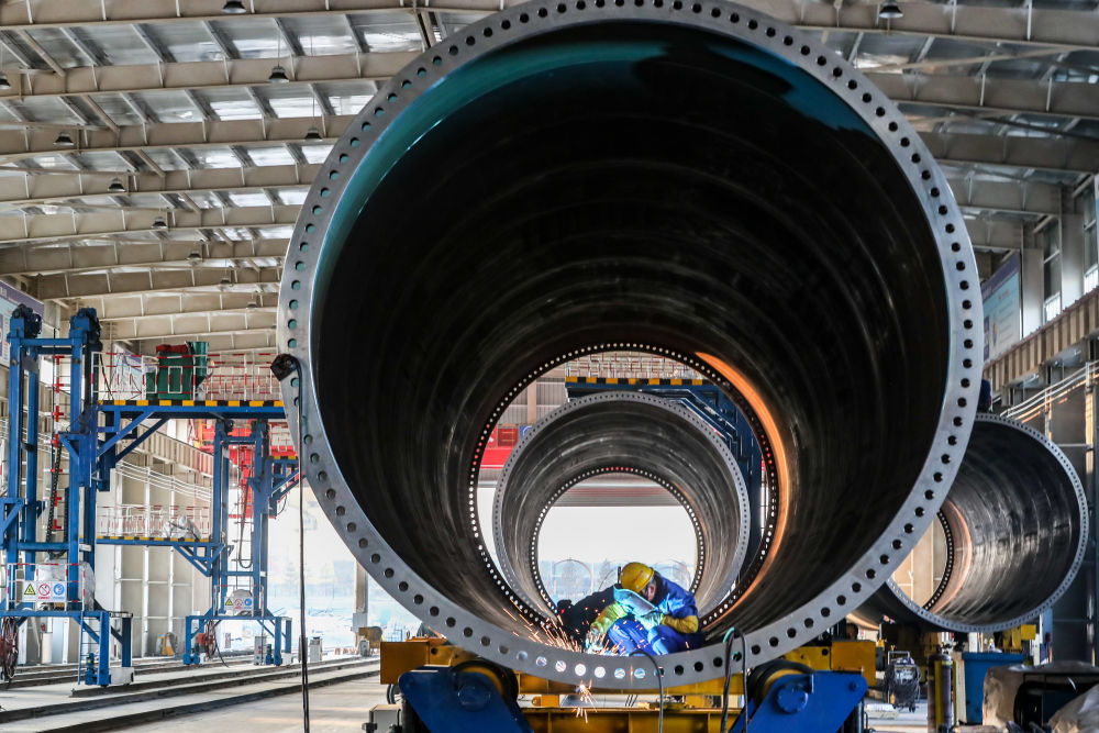 11月20日,在甘肅省酒泉經(jīng)濟技術(shù)開發(fā)區(qū)的中國水電四局(酒泉)新能源裝備有限公司塔筒制造車間,工作人員進行風(fēng)機塔筒焊接作業(yè)。新華社記者 郎兵兵 攝
