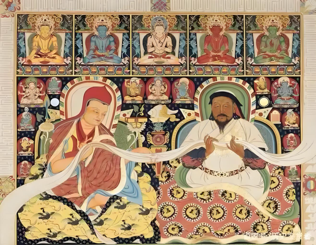 蒙古族自元朝以來普遍信仰藏傳佛教,也改變了中國北方和西北民族、邊疆的政治、地域和宗教文化面貌。同時,蒙古人長期以來在西藏地方的政治和宗教史上都扮演了極為重要的角色,從八思巴與忽必烈,到三世達(dá)賴?yán)锱c俺答汗、五世達(dá)賴?yán)锱c固始汗,他們之間都建立起了“施供關(guān)系”,體現(xiàn)了蒙藏之間緊密的政教關(guān)系。