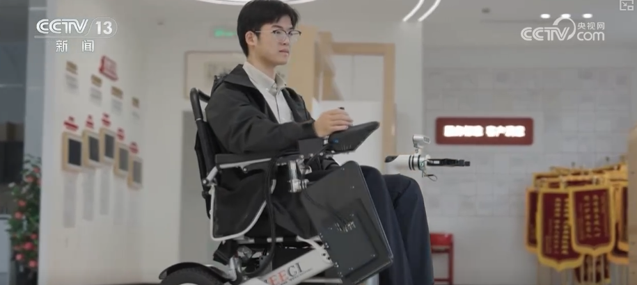 在杭州西湖區(qū),工作人員正在對眼前這款智能輪椅進行技術升級。結合失能老人手腳行動不便的痛點,這款輪椅搭載了深度相機和智能機械臂,通過內置的AI算法,使用者只需和平常一樣坐在上面,簡單用語言表達需求,輪椅就可以判斷路線,智能移動。