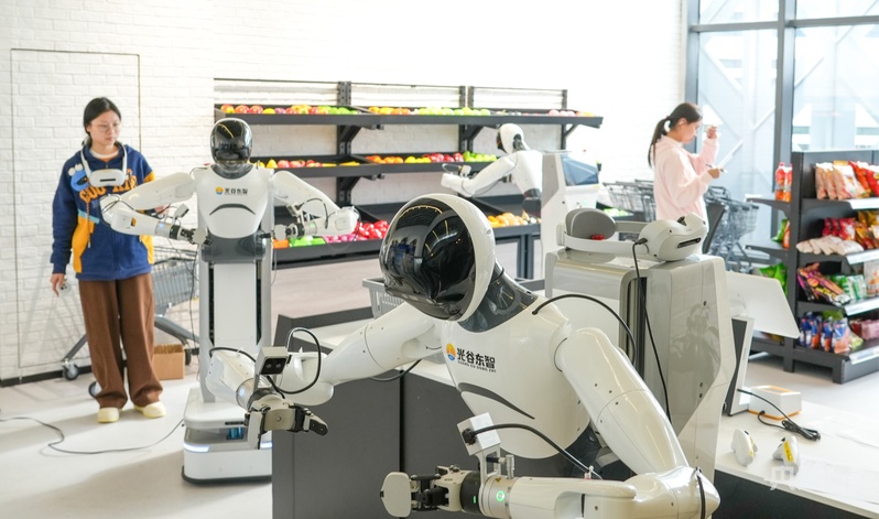 人形機(jī)器人在零售應(yīng)用場(chǎng)景訓(xùn)練(央廣網(wǎng)記者鄧子依 攝)
