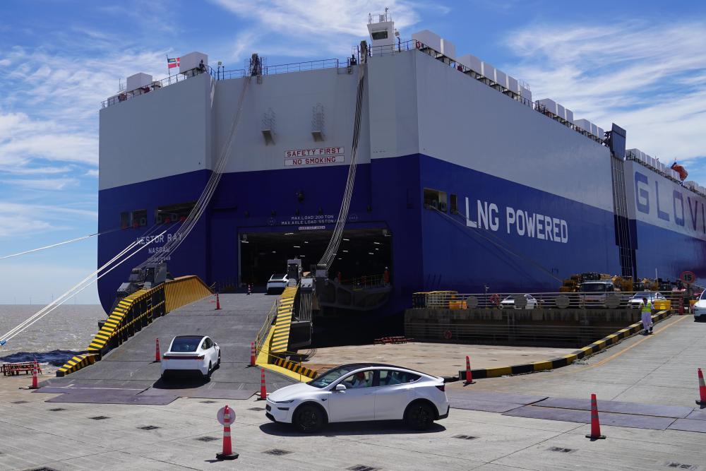 2025年7月2日,在上海自貿(mào)試驗區(qū)臨港新片區(qū)南港碼頭,一批新能源汽車駛向一艘滾裝貨輪。新華社記者 楊有宗 攝