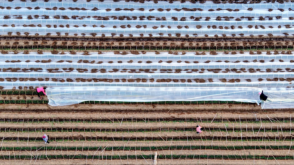 12月11日,在山東省臨沂市平邑縣地方鎮(zhèn),村民為種植的蔬菜幼苗覆蓋保溫薄膜(無人機照片)。 新華社發(fā)(武紀全攝)