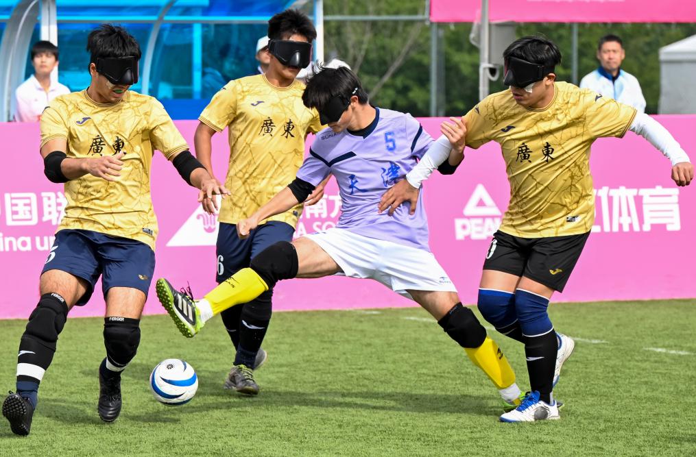 12月14日,在廣州舉行的全國(guó)第十二屆殘疾人運(yùn)動(dòng)會(huì)暨第九屆特殊奧林匹克運(yùn)動(dòng)會(huì)盲人足球項(xiàng)目男子組小組賽中,天津隊(duì)1:0戰(zhàn)勝?gòu)V東二團(tuán)隊(duì)。圖為天津隊(duì)球員范海林(右二)在比賽中突破。新華社記者 陳浩明 攝