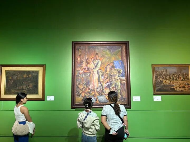 參觀者在菲律賓國(guó)家美術(shù)館二戰(zhàn)主題展廳參觀,該展廳陳列著二十余幅描繪日軍暴行的畫(huà)作。(新華社記者 張怡晟 攝)
