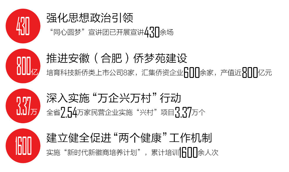 堅持和落實“兩個毫不動搖”,建立健全促進“兩個健康”工作機制。持續(xù)優(yōu)化民營經(jīng)濟發(fā)展環(huán)境,促進經(jīng)濟社會高質(zhì)量發(fā)展。召開全省民營經(jīng)濟統(tǒng)戰(zhàn)工作會議,明確36項重點任務和55家責任單位,建立13家省直單位組成的聯(lián)席會議制度。聚焦凝心鑄魂,全省統(tǒng)戰(zhàn)系統(tǒng)累計開展理想信念教育和經(jīng)濟形勢政策教育808場次,覆蓋3.82萬人次民營經(jīng)濟人士。突出年輕一代培育,實施“新時代新徽商培養(yǎng)計劃”,累計培訓1600余人次,建立約2500人的代表人士數(shù)據(jù)庫,推動青年商會組織省市全覆蓋,推薦4300余名優(yōu)秀青年企業(yè)家進入各級人大、政協(xié)。引導企業(yè)履行社會責任,完成光彩事業(yè)發(fā)起實施30周年相關調(diào)研及先進典型推薦宣傳工作。