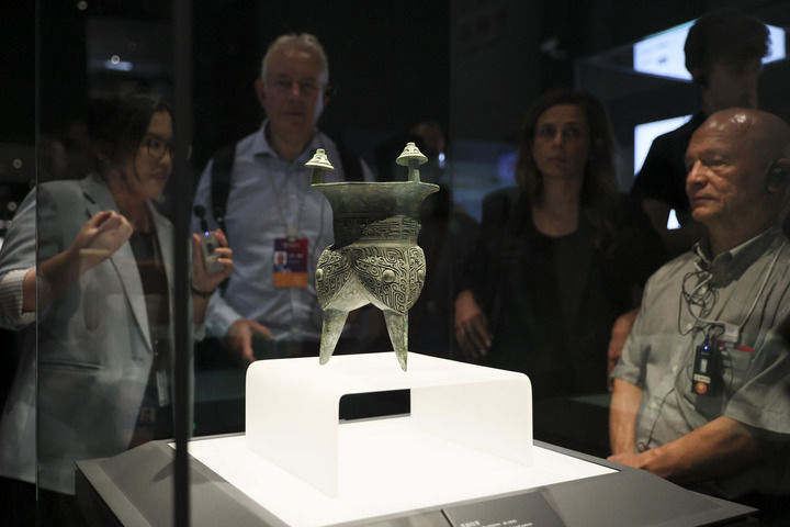2025年10月13日,第二屆世界中國學(xué)大會“中國式現(xiàn)代化”主題參訪活動嘉賓在上海博物館東館青銅館參觀。新華社記者 王翔 攝