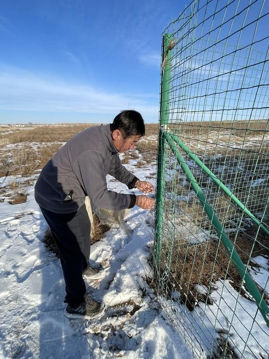高萬東在修復(fù)損壞的長城保護圍欄。新華社發(fā)
