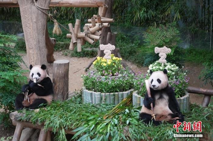 2025年7月7日,在韓國(guó)誕生的雌性大熊貓雙胞胎“睿寶”和“輝寶”迎來(lái)兩周歲生日。位于韓國(guó)龍仁的愛(ài)寶樂(lè)園為它們舉辦慶生活動(dòng)。圖為大熊貓“睿寶”(左)和“輝寶”在生日會(huì)上。