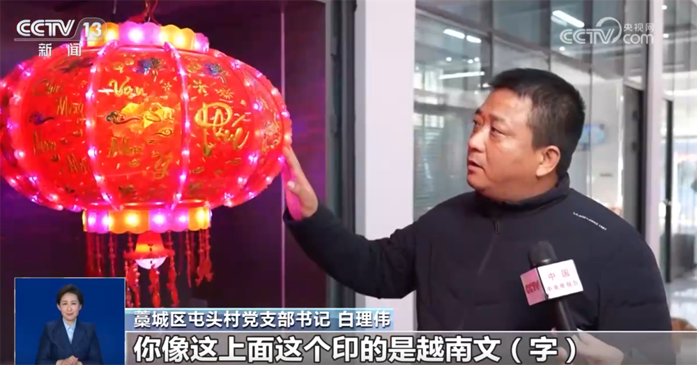 藁城區(qū)屯頭村黨支部書記 白理偉:通過宮燈博覽會(huì),對接了市場、增加了客戶,你像這個(gè)上面印的是越南文字,一些吉祥話,這是近兩年新開發(fā)的產(chǎn)品。