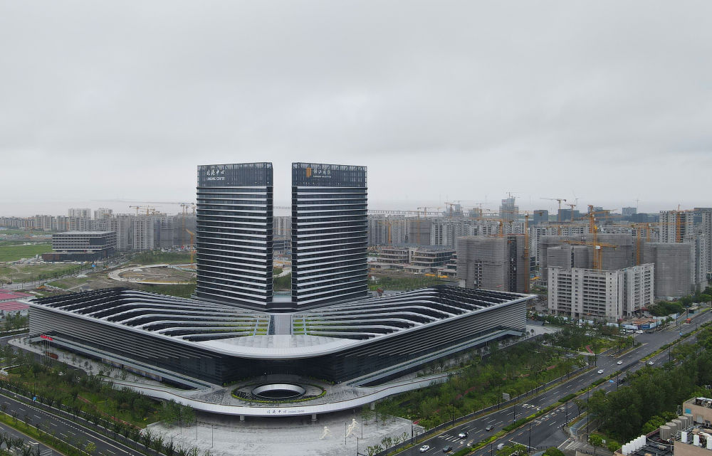 這是中國(上海)自由貿(mào)易試驗區(qū)臨港新片區(qū)滴水湖西島建設(shè)中的中銀金融中心大樓(無人機(jī)照片,2024年3月27日攝)。