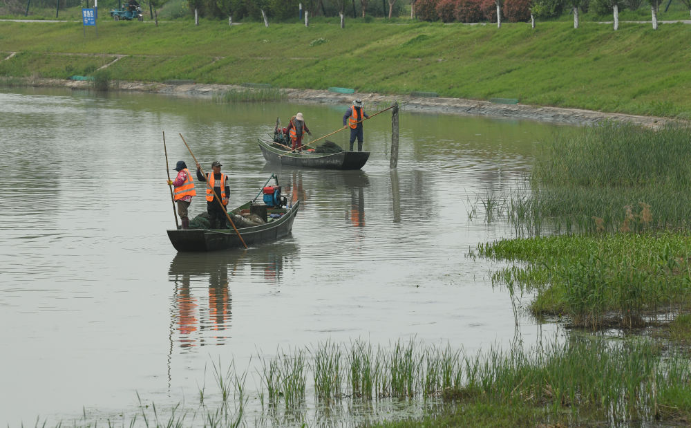 2024年4月11日,在浙江省湖州市吳興區(qū),河道保潔員在太湖沿岸清理非法捕魚地籠網。