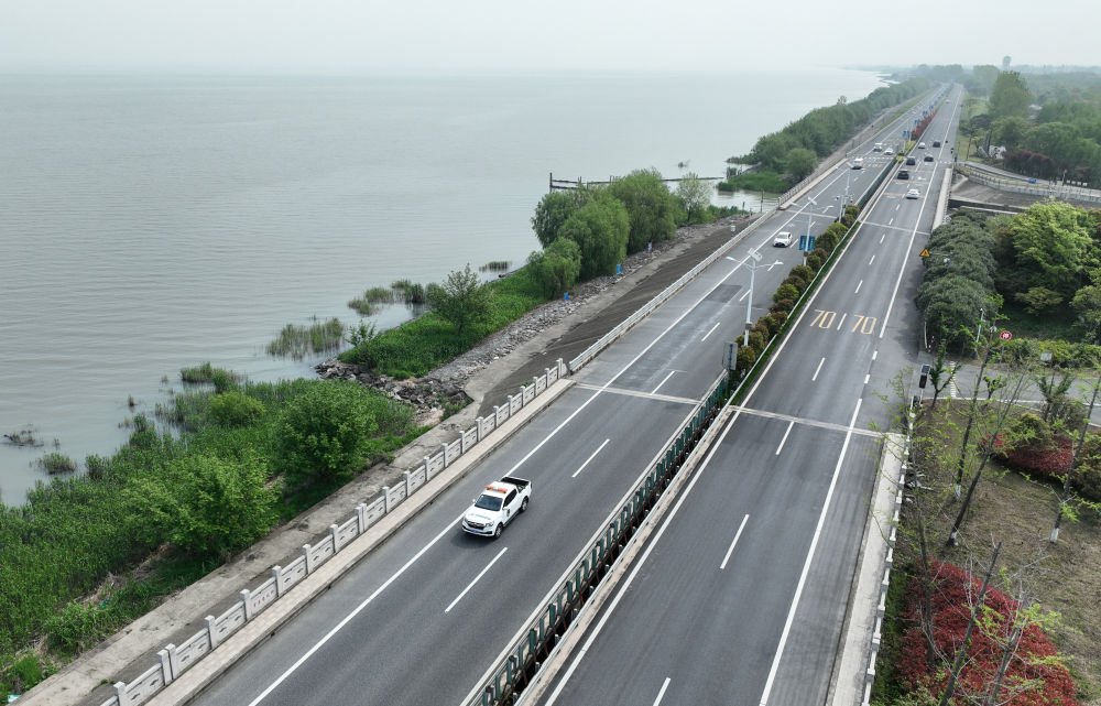 2024年4月11日,浙江省湖州市吳興區(qū)綜合行政執(zhí)法局高新區(qū)中隊執(zhí)法人員駕車在太湖沿岸巡查 (無人機照片)。