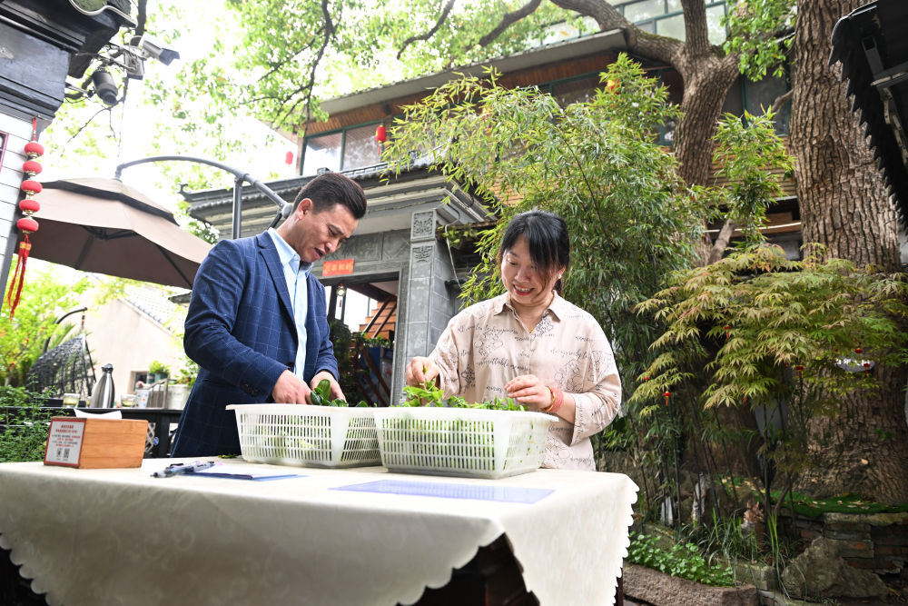 2024年4月11日,在江蘇省蘇州市吳中區(qū)金庭鎮(zhèn),退捕漁民沈雪榮和妻子沈燕燕在自家經營的農家樂“美味漁家蟹園”擇菜?!巴瞬逗螅纳鷳B(tài)環(huán)境越來越好,游客越來越多,我們家的農家樂生意也越來越紅火。”沈雪榮感慨道。
