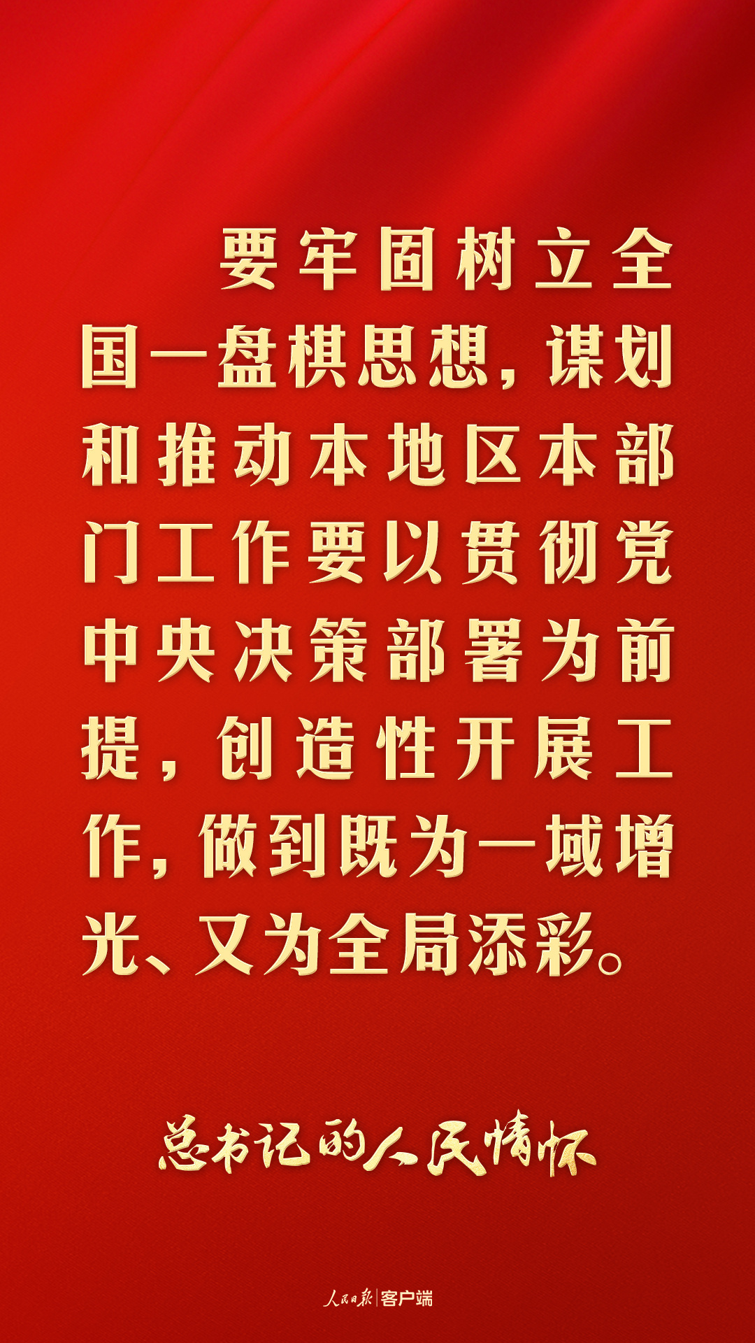 “要牢固樹立全國一盤棋思想,謀劃和推動(dòng)本地區(qū)本部門工作要以貫徹黨中央決策部署為前提,創(chuàng)造性開展工作,做到既為一域增光、又為全局添彩?!?/p>