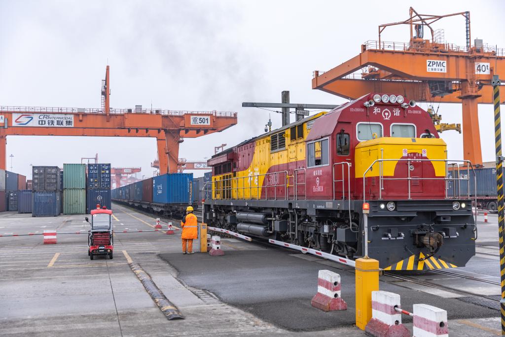 3月7日,一列滿載機(jī)械設(shè)備、整車及零部件等貨物的中歐班列在重慶團(tuán)結(jié)村中心站等候發(fā)車。 新華社記者 黃偉 攝