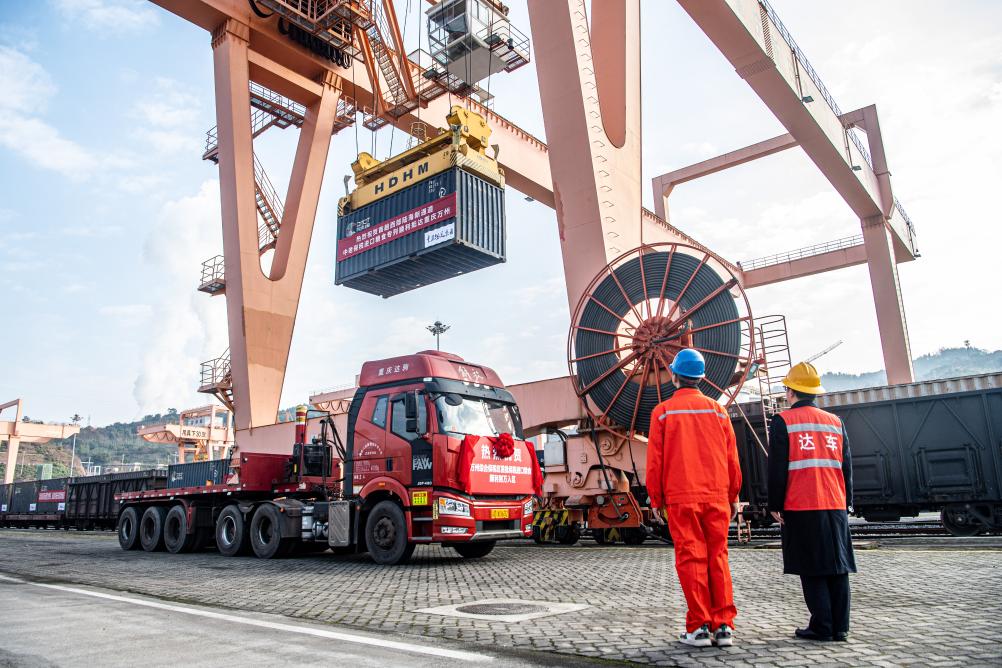 1月4日,在重慶萬州新田港站,工作人員進(jìn)行集裝箱吊裝作業(yè),將專列貨物轉(zhuǎn)運(yùn)至公路物流環(huán)節(jié)。 新華社記者 唐奕 攝