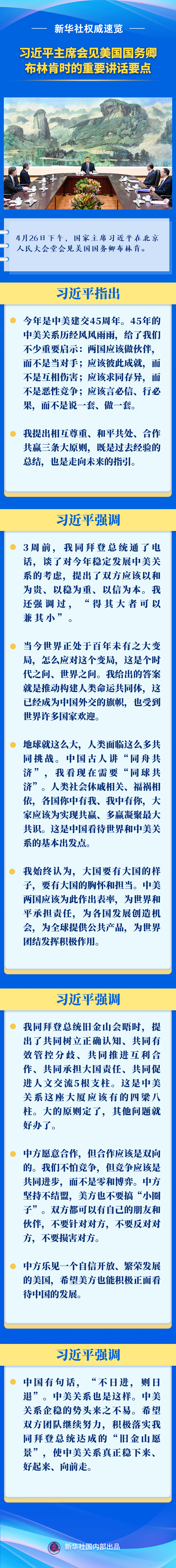 4月26日下午,國(guó)家主席習(xí)近平在北京人民大會(huì)堂會(huì)見美國(guó)國(guó)務(wù)卿布林肯。來(lái)看習(xí)近平主席的重要講話要點(diǎn)。