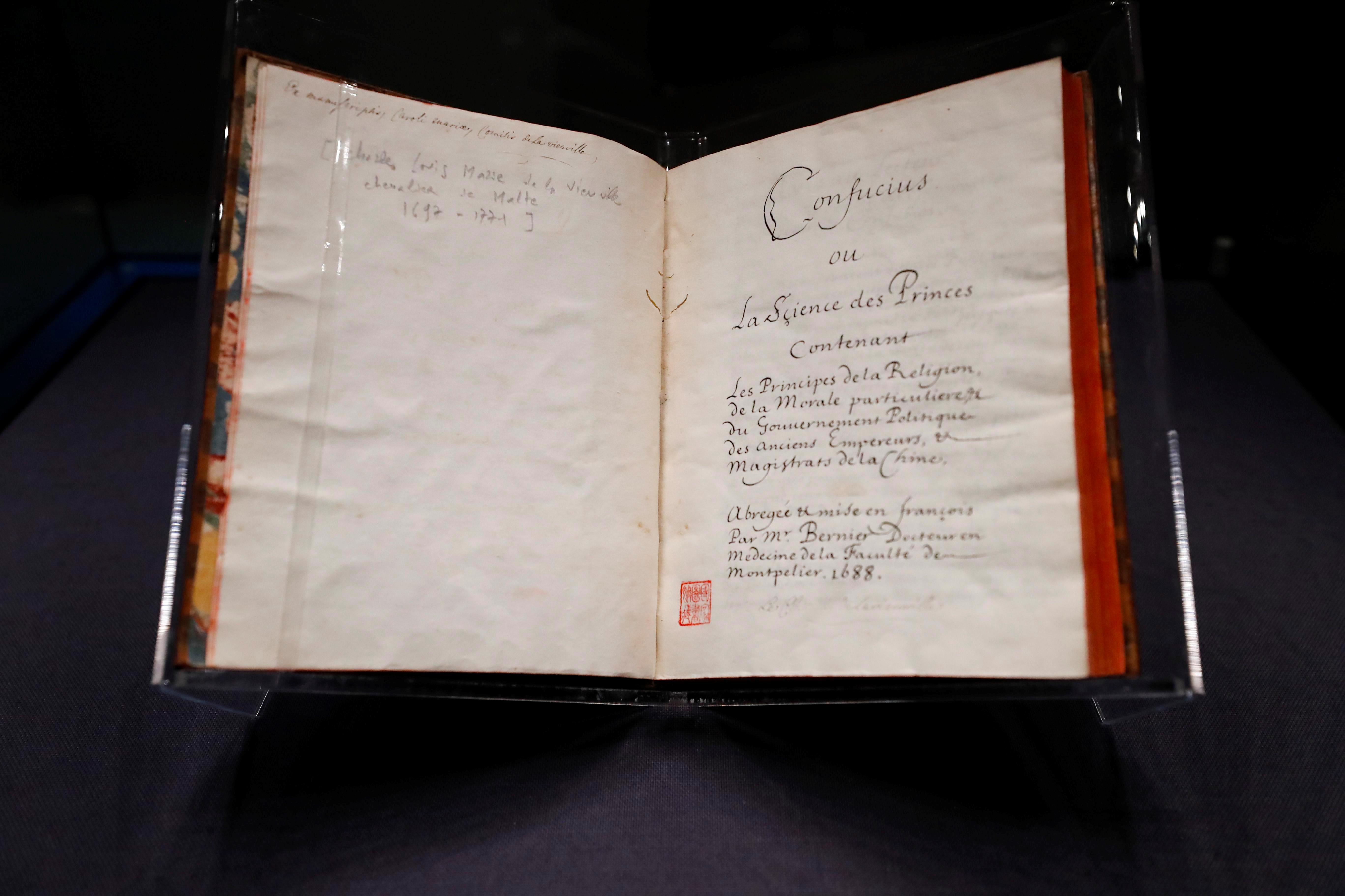 1688年,首部《論語(yǔ)導(dǎo)讀》法文版原著正式出版。牛皮封面、飄口燙金、染紋紙環(huán)襯、書(shū)口刷紅……這是一本富有法國(guó)啟蒙時(shí)期書(shū)籍裝幀特征的古老典籍,世界上僅存兩本。