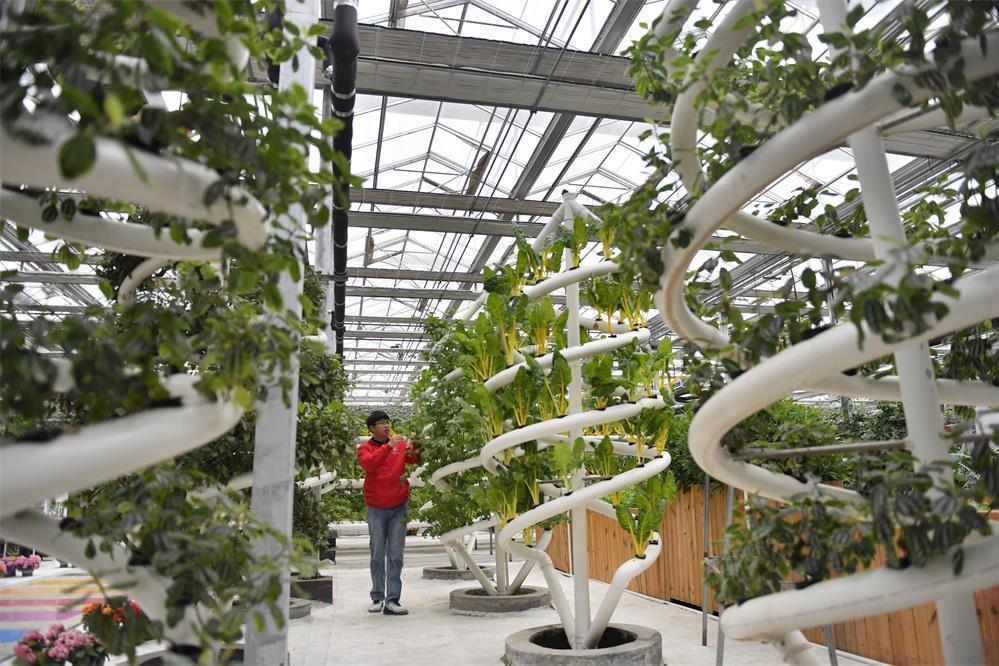 △2023年5月13日,在河北曲周縣育苗產(chǎn)業(yè)園,苗樂園科技小院的學生在查看無土栽培蔬菜。