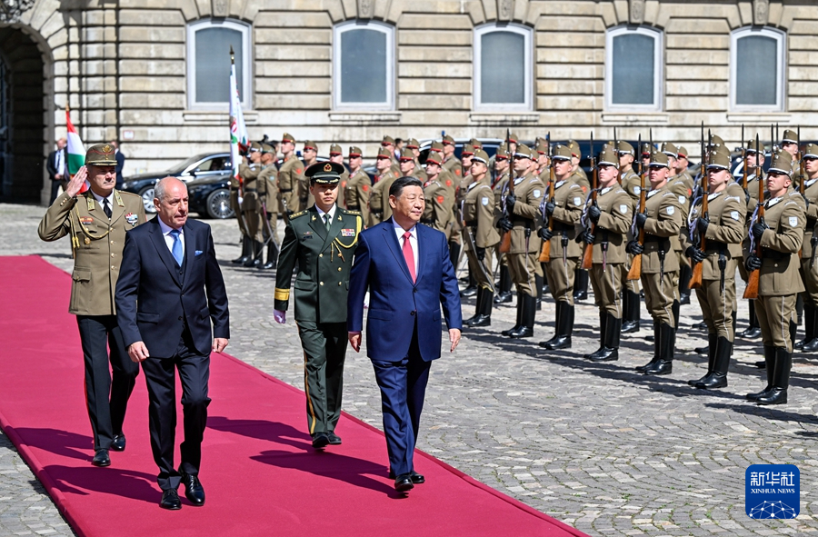 當(dāng)?shù)貢r間5月9日上午,國家主席習(xí)近平在布達佩斯出席匈牙利總統(tǒng)舒尤克和總理歐爾班共同舉行的隆重歡迎儀式。這是習(xí)近平在舒尤克陪同下檢閱儀仗隊。新華社記者 殷博古 攝