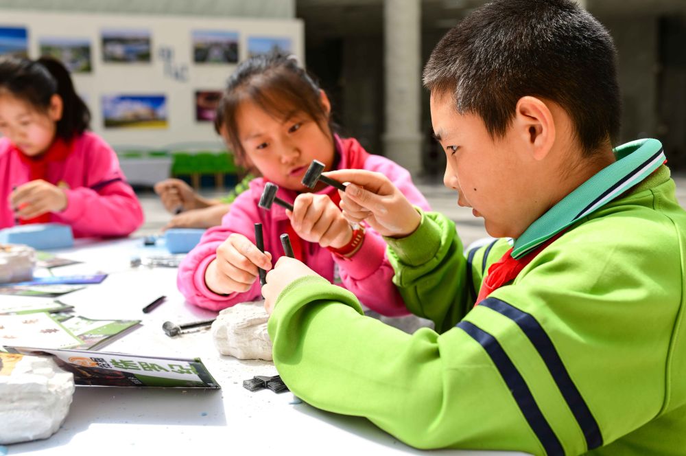 2024年4月22日,內(nèi)蒙古自治區(qū)鄂爾多斯市康巴什區(qū)實驗小學(xué)在康巴什自然博物館開展“探索自然奧秘 保護地球家園”主題研學(xué)活動,這是學(xué)生在研學(xué)課程中體驗尋找動物化石。
