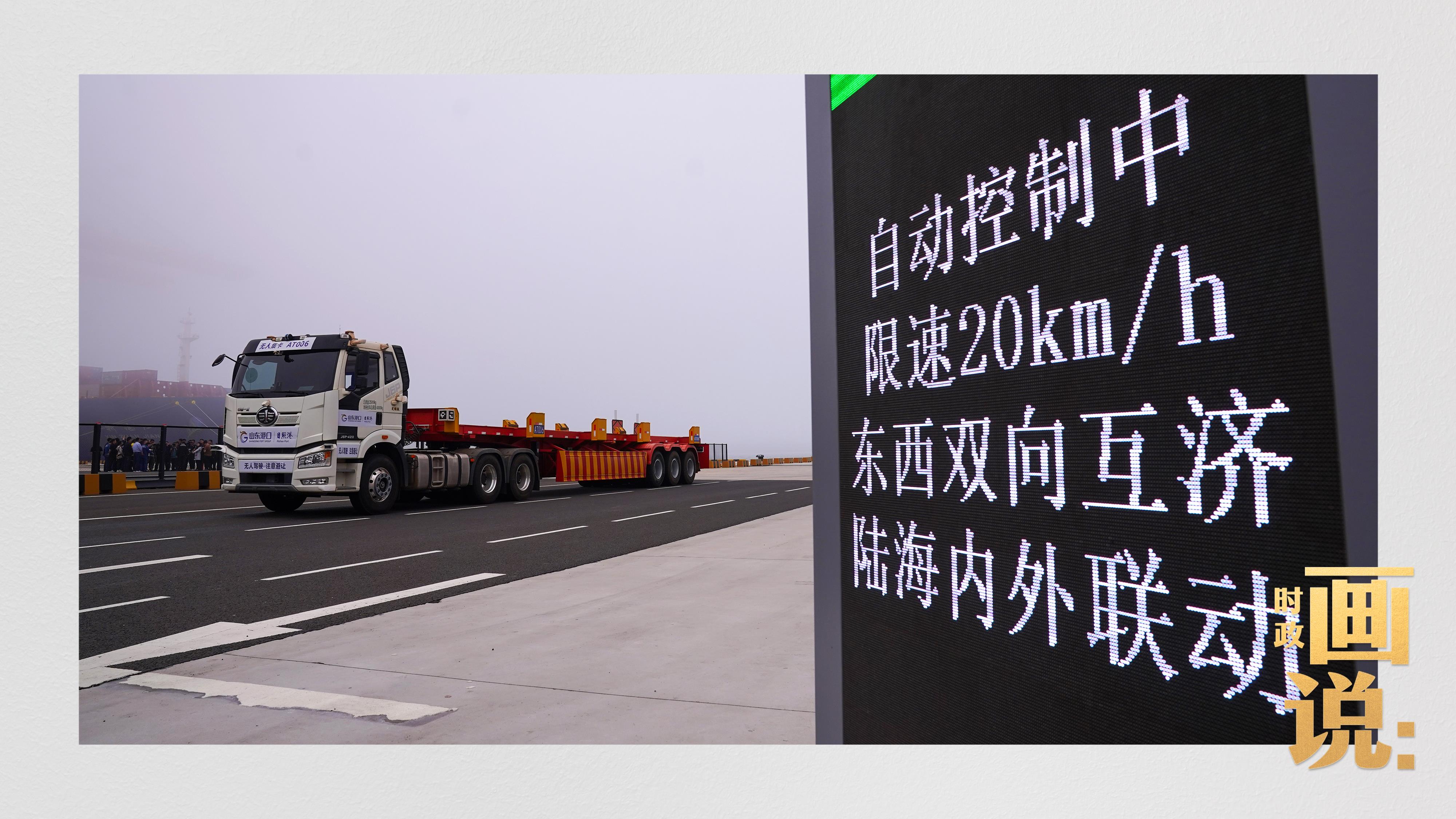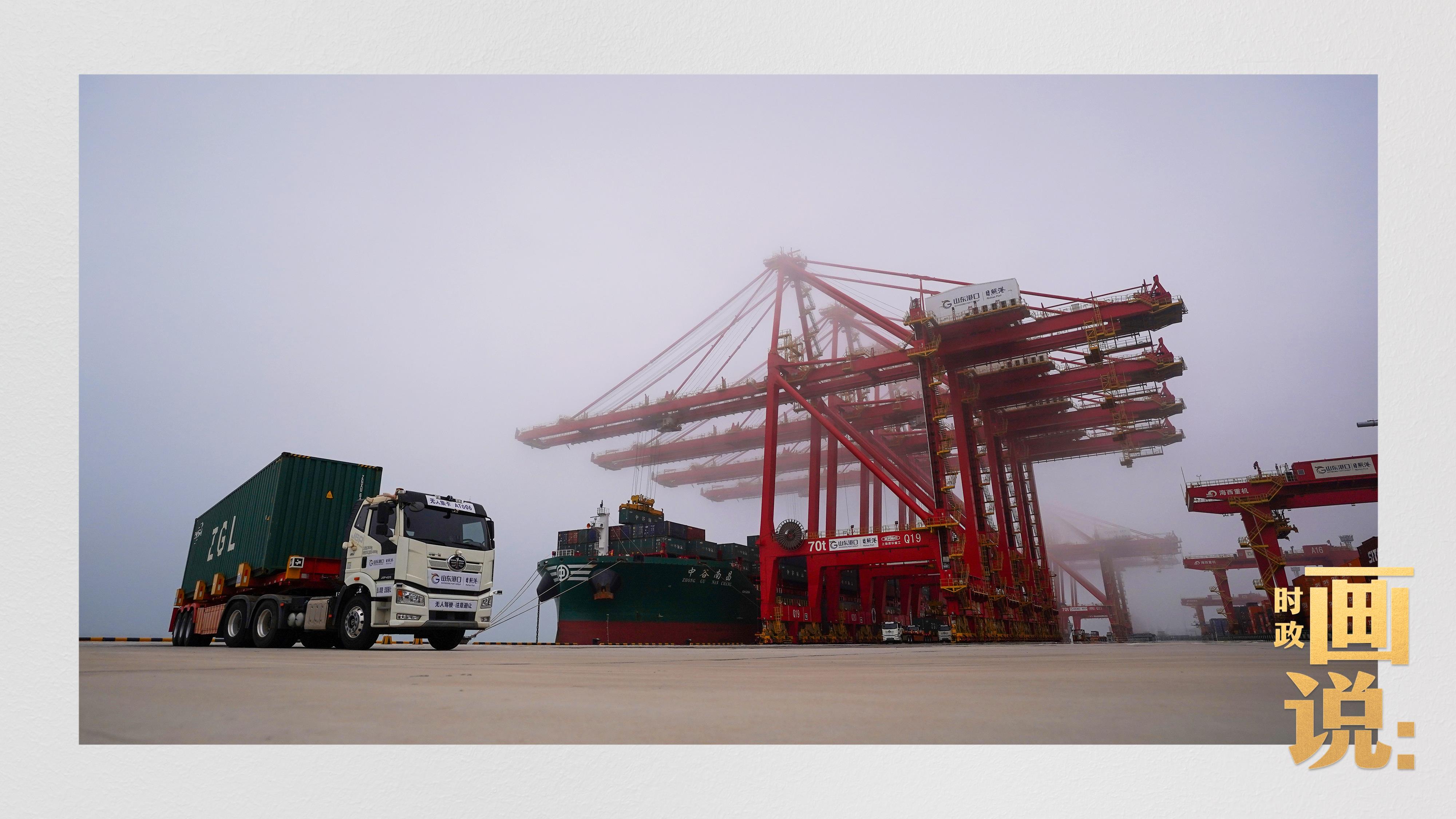 山東港口集團(tuán)日照港順岸開(kāi)放式全自動(dòng)化集裝箱碼頭,無(wú)人集卡車在運(yùn)送集裝箱。