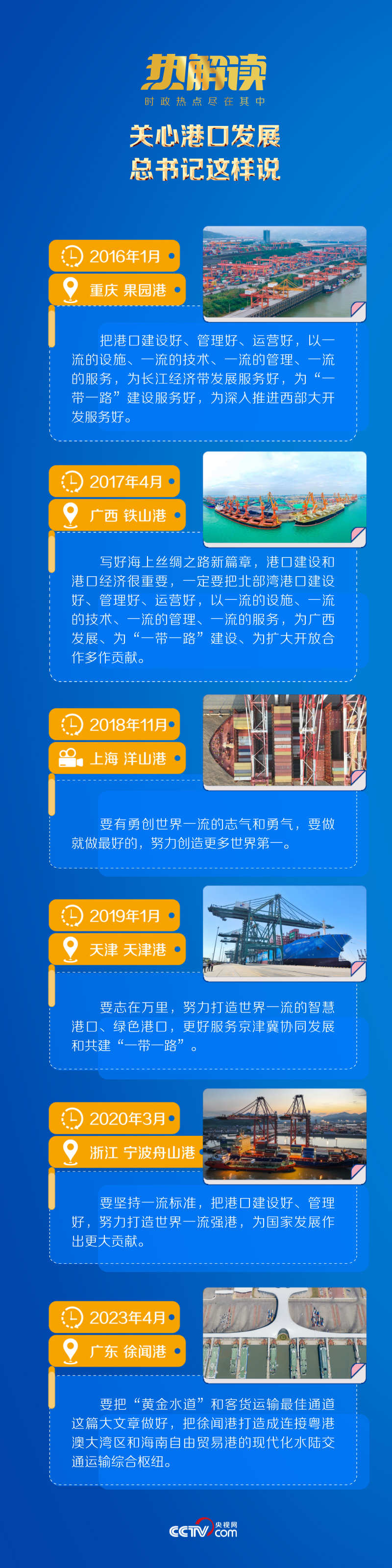 總書(shū)記曾深刻指出:“經(jīng)濟(jì)強(qiáng)國(guó)必定是海洋強(qiáng)國(guó)、航運(yùn)強(qiáng)國(guó)?!彼M覈?guó)港口建設(shè)“要志在萬(wàn)里”,“為國(guó)家發(fā)展作出更大貢獻(xiàn)”。