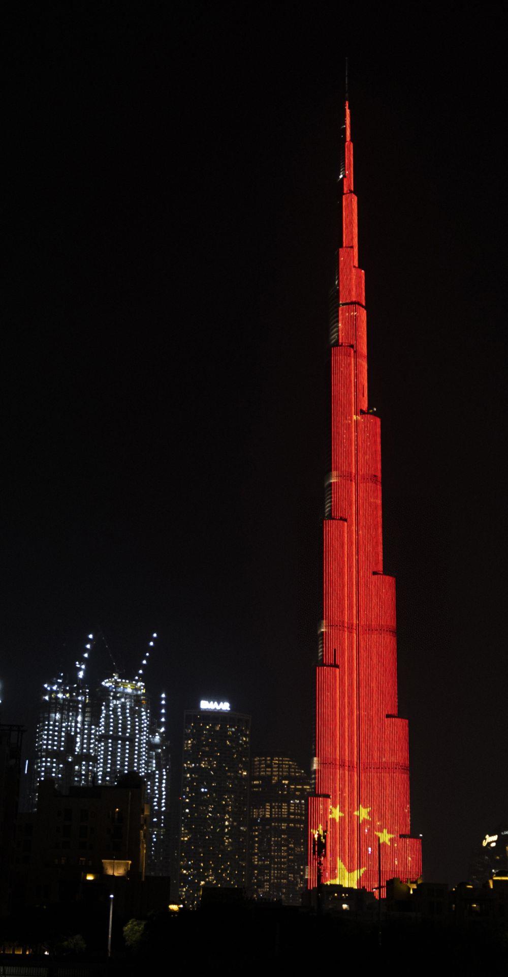 當?shù)貢r間2020年2月2日,在阿聯(lián)酋迪拜,當?shù)氐貥私ㄖ锕ㄋc亮中國國旗圖案,為中國抗擊新冠肺炎疫情加油。