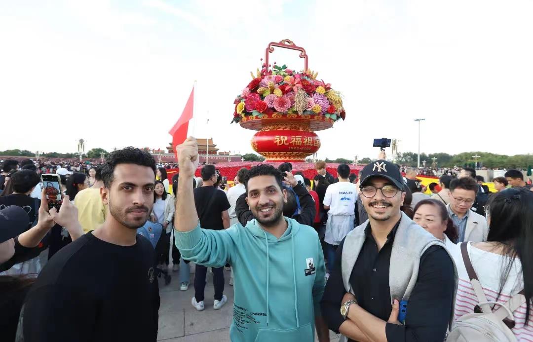 2023年10月1日,三位來自阿爾及利亞的游客在北京天安門廣場“祝福祖國”巨型花籃前留影。