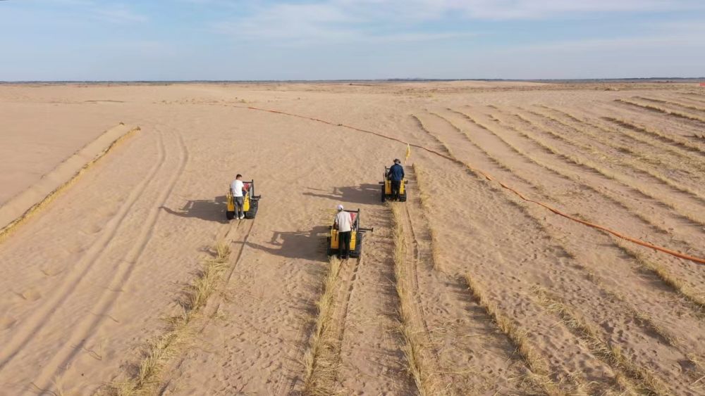 在內(nèi)蒙古巴彥淖爾市烏拉特后旗西補(bǔ)隆林業(yè)管護(hù)中心,4臺(tái)裝有履帶的壓沙機(jī)正在沙地里“插秧”——小推車(chē)大小的壓沙機(jī)前方都裝有一個(gè)直徑80厘米的大齒輪,壓沙機(jī)前進(jìn)一米,大齒輪就會(huì)將早已均勻鋪在沙地上的稻草、秸稈精準(zhǔn)“植”入沙地里。不一會(huì)兒,一條條金黃色的沙障“編織”完成,將沙丘牢牢縛住。