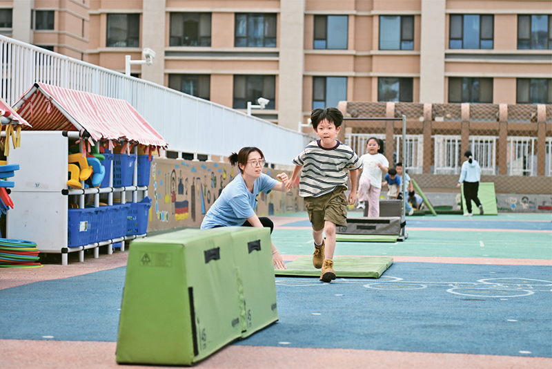 近年來,河北雄安新區(qū)通過創(chuàng)新教育發(fā)展體制機(jī)制、高標(biāo)準(zhǔn)配建教育設(shè)施、引入專業(yè)教師隊(duì)伍、引進(jìn)優(yōu)質(zhì)教育資源等方式,不斷推動(dòng)教育高質(zhì)量發(fā)展。圖為2024年5月23日,當(dāng)?shù)赜變簣@的孩子們在室外活動(dòng)。 新華社記者 牟宇/攝