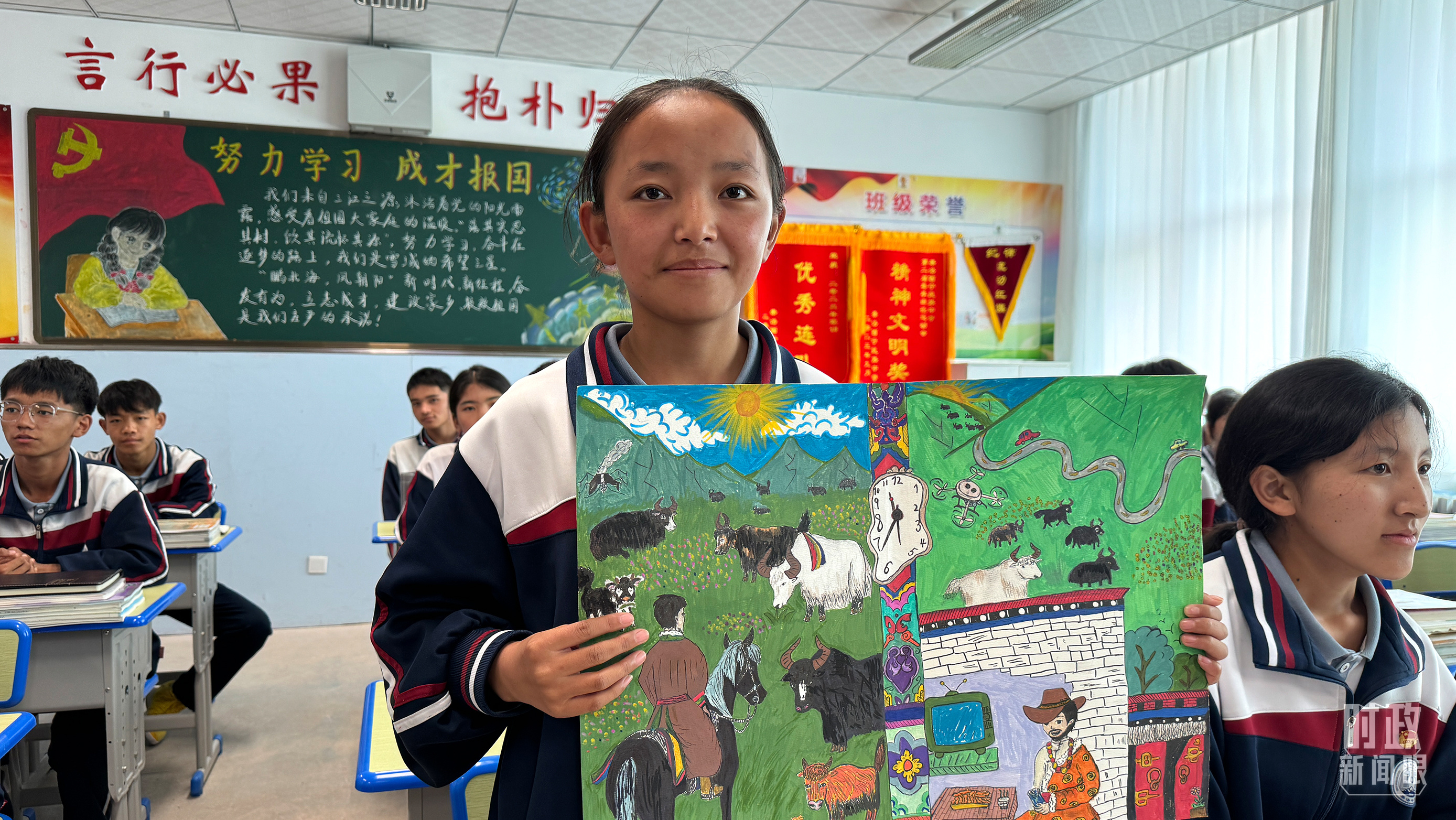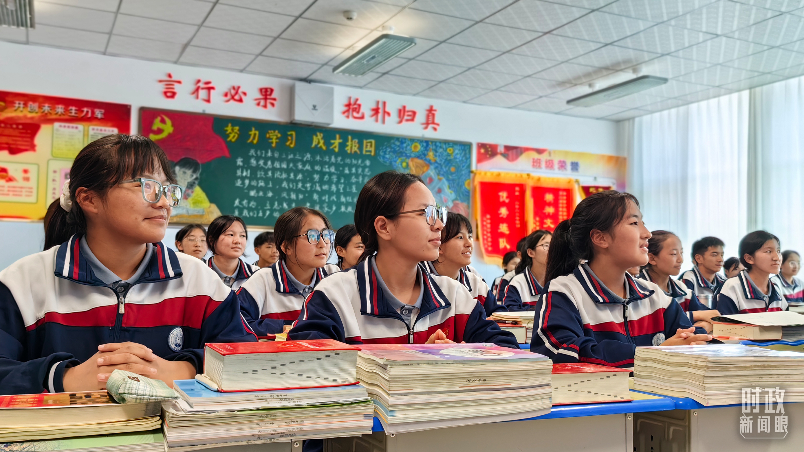 果洛西寧民族中學(xué)高一(1)班的“新時(shí)代、新家鄉(xiāng)”主題思政課。(總臺(tái)央視記者許永松、國(guó)廣記者李晉拍攝)