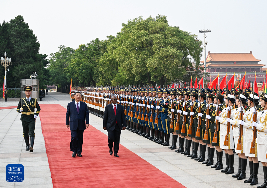 會(huì)談前,習(xí)近平和夫人彭麗媛在人民大會(huì)堂東門(mén)外廣場(chǎng)為恩巴洛和夫人迪尼西婭舉行歡迎儀式。