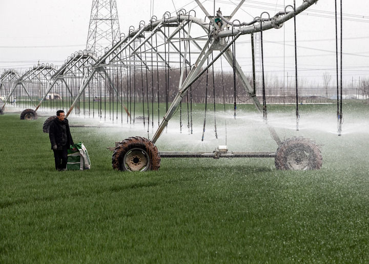 2024年3月18日,在河南省焦作市博愛縣孝敬鎮(zhèn)東原莊村瑞輝家庭農(nóng)場(chǎng),村民使用全自動(dòng)指針式噴灌機(jī)進(jìn)行澆灌作業(yè)。