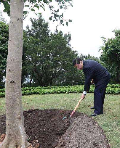 8年前種下的那棵高山榕已是亭亭如蓋、枝繁葉茂,展現(xiàn)出蓬勃的生命活力??倳涀叩綐湎拢钣懈锌卣f:“8年了,彈指一揮間啊。選的這個(gè)地方很好,樹冠能展開,樹長得也快。”