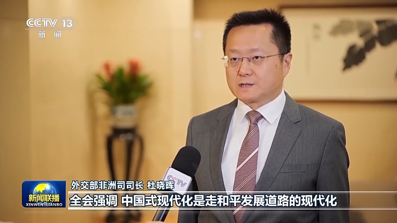 外交部非洲司司長 杜曉暉:全會強調(diào),中國式現(xiàn)代化是走和平發(fā)展道路的現(xiàn)代化,開放是中國式現(xiàn)代化的鮮明標(biāo)識。在百年變局加速演進(jìn)、世界進(jìn)入新的動蕩變革期的大背景下,三中全會給世界注入和平力量、穩(wěn)定力量、進(jìn)步力量、發(fā)展力量。我們將以習(xí)近平外交思想為指引,堅定奉行獨立自主的和平外交政策,推動構(gòu)建人類命運共同體,為以中國式現(xiàn)代化全面推進(jìn)強國建設(shè)、民族復(fù)興偉業(yè)營造更有利國際環(huán)境、提供更堅實戰(zhàn)略支撐。