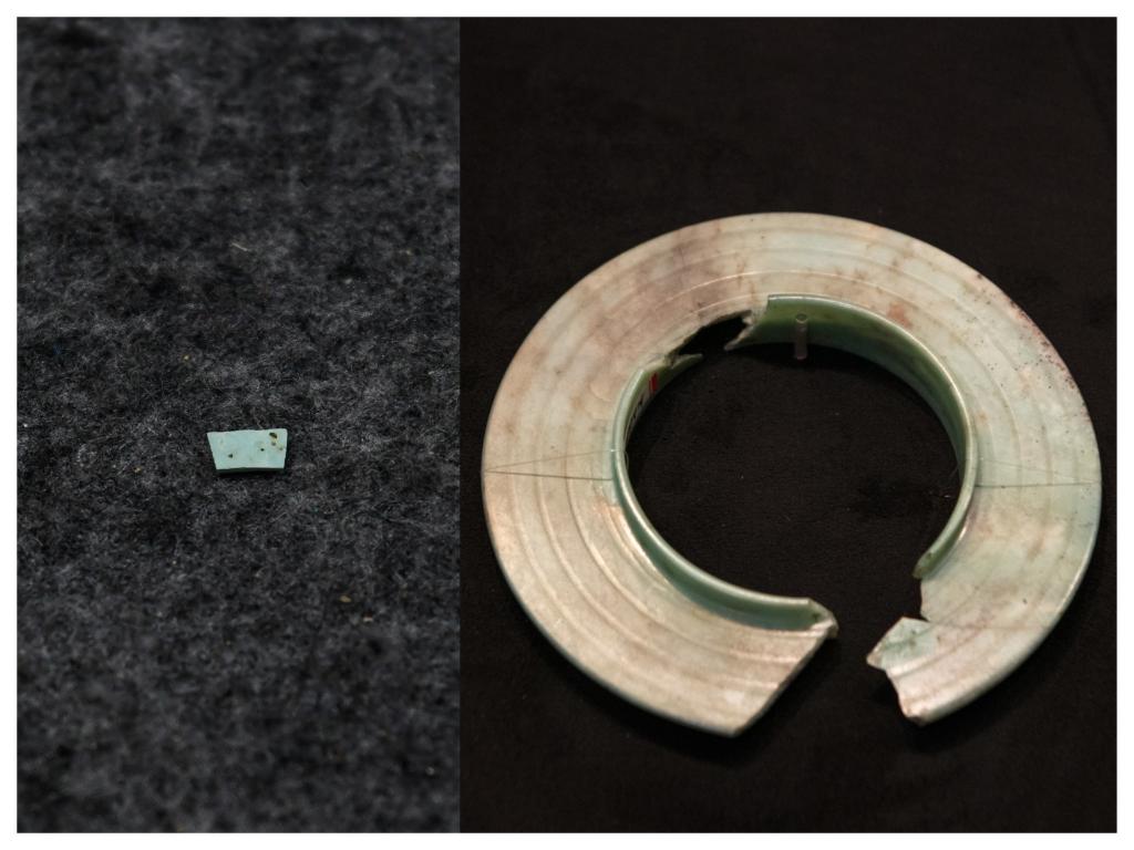 拼版照片:左圖為2024年7月10日拍攝的三星堆遺址出土的綠松石片(新華社記者王曦 攝),右圖為2024年7月21日在三星堆博物館文物保護與修復館拍攝的有領(lǐng)玉璧(新華社記者唐文豪 攝)。