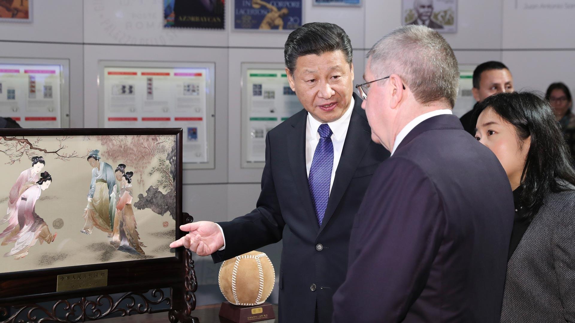 2017年1月,習(xí)近平主席在訪問瑞士期間專程來到坐落在洛桑半山腰的國際奧林匹克博物館。這是中國國家元首首次到訪。習(xí)近平主席代表中國向國際奧委會贈送了蘇繡《仕女蹴鞠圖》,并在留言簿上用中文寫下:“弘揚奧運精神,促進和平發(fā)展”。