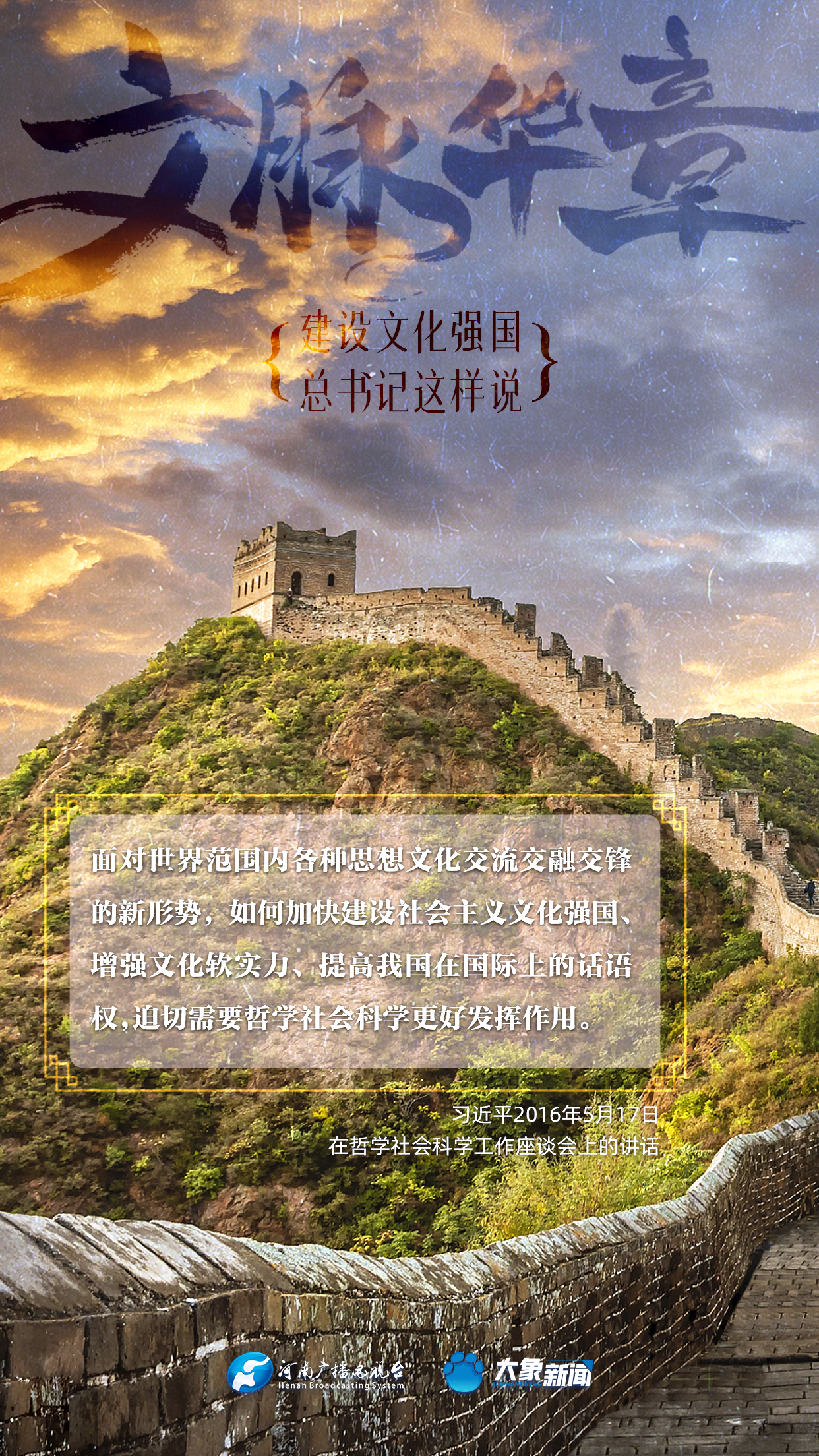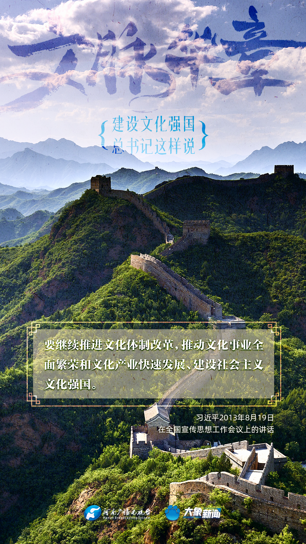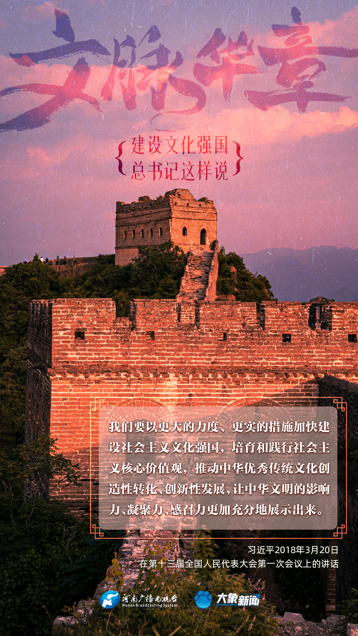 黨的十八大以來,習(xí)近平總書記站在全局和戰(zhàn)略高度,就建設(shè)社會(huì)主義文化強(qiáng)國(guó)提出一系列新思想新觀點(diǎn)新論斷,為我們堅(jiān)定文化自信,堅(jiān)持中國(guó)特色社會(huì)主義文化發(fā)展道路,提供了指引。大象新聞與您一起學(xué)習(xí)、領(lǐng)悟。