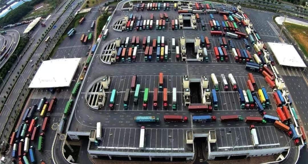 浙江義烏港等待通關(guān)的集裝箱貨車(chē)