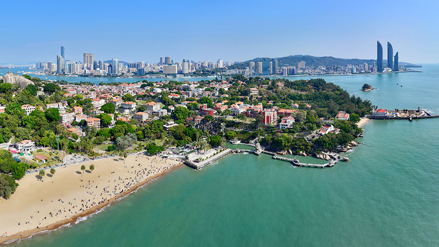 游人在廈門鼓浪嶼沙灘上游玩(無人機(jī)照片)。新華社記者 姜克紅 攝