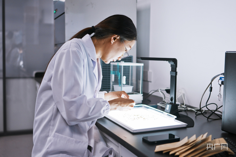 科研人員在實(shí)驗(yàn)室進(jìn)行考種工作(央廣網(wǎng)記者 張羲輪 攝)
