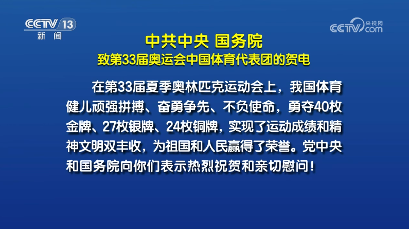 8月11日,中共中央、國務(wù)院向第33屆夏季奧運(yùn)會(huì)中國體育代表團(tuán)致賀電,高度評(píng)價(jià)我國體育健兒“實(shí)現(xiàn)了運(yùn)動(dòng)成績和精神文明雙豐收,為祖國和人民贏得了榮譽(yù)”。賀電指出,我國體育健兒們以優(yōu)異成績和出色表現(xiàn),進(jìn)一步激發(fā)了海內(nèi)外中華兒女的愛國熱情、振奮了民族精神、凝聚了奮進(jìn)力量。