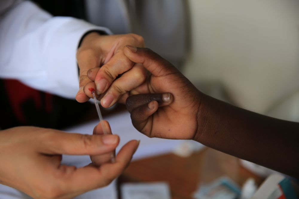2018年12月8日,在馬拉維南部布蘭太爾市卡迪迪村衛(wèi)生院,第六批中國援馬拉維醫(yī)療隊(duì)醫(yī)生在義診活動(dòng)中為當(dāng)?shù)鼐用駲z測瘧疾。