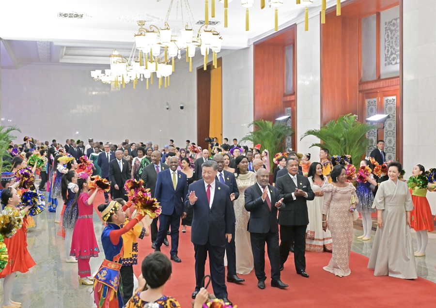 9月4日晚,國家主席習近平和夫人彭麗媛在北京人民大會堂舉行宴會,歡迎來華出席中非合作論壇北京峰會的非方及國際貴賓。這是在前往宴會廳沿途,少年兒童對國際貴賓表示熱烈歡迎。新華社記者 張領 攝