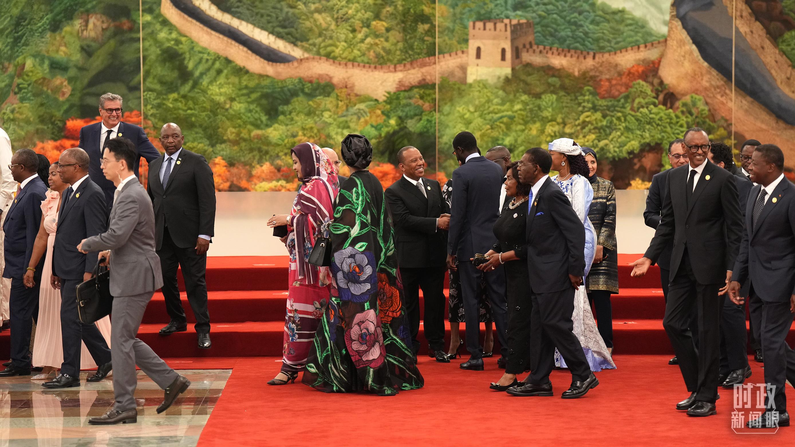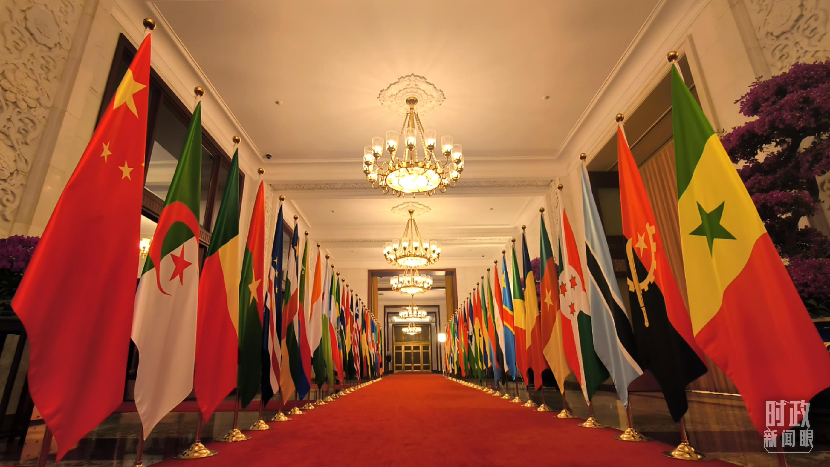 人民大會(huì)堂北大廳,中國(guó)國(guó)旗和中非合作論壇成員國(guó)國(guó)旗以及非洲聯(lián)盟旗幟交相輝映,巨幅蘇繡壁畫(huà)《長(zhǎng)城》氣勢(shì)恢宏。
