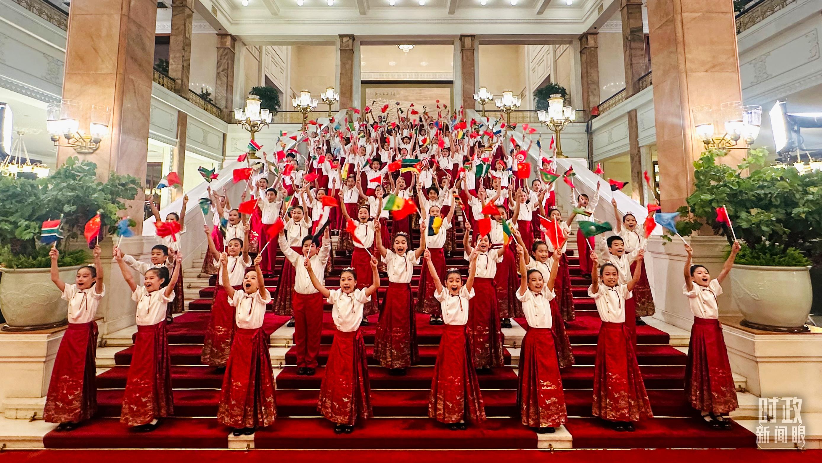 壁畫(huà)緩緩打開(kāi),百余名身著中國(guó)傳統(tǒng)服飾的少年兒童揮舞著旗幟,熱情演唱《把未來(lái)點(diǎn)亮》、《歌聲與微笑》、非洲歌曲《Waka Waka》等。
