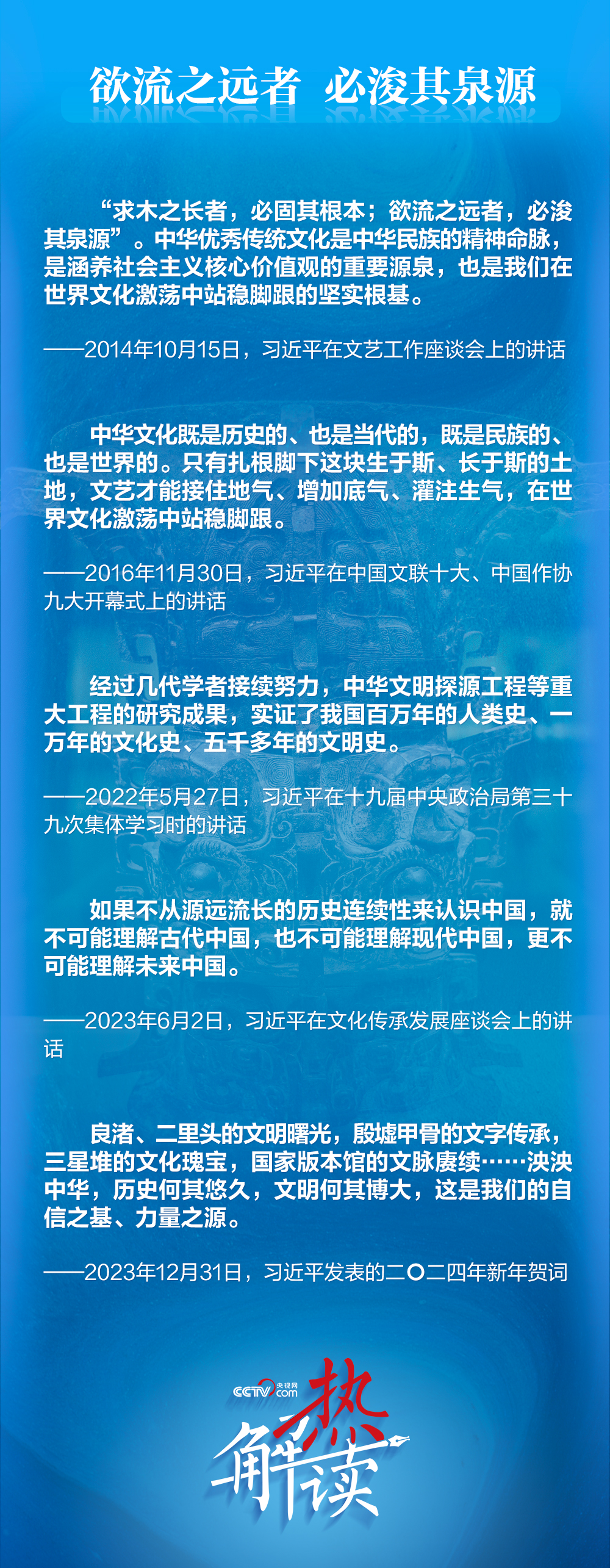 一件件文物、一處處文化古跡、一項(xiàng)項(xiàng)文化藝術(shù),串連起中華民族的文化史,蘊(yùn)藏著“何以中國”的文化力量。總書記對中華文明之源的關(guān)注,彰顯的正是他對推動文化繁榮、建設(shè)文化強(qiáng)國的深刻思考和文化自信。